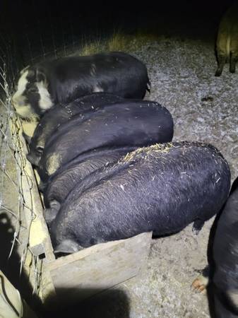 Several American Guinea Hogs for sale. I have uncut males and females. They were born 7/21/25. Around 100 lbs right now. Some are quite friendly, others less so, but none are aggressive. They have been handled and socialized with other pigs and children since birth. A couple would be good for breeding, but mostly are meat pigs.